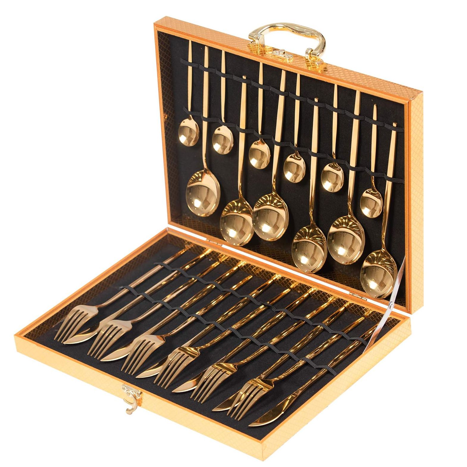 The tableware set consist of tea spoon*6; dinner spoon*6; dinner fork*6; dinner knife*6. Total 24 pieces, service for 6 people.
