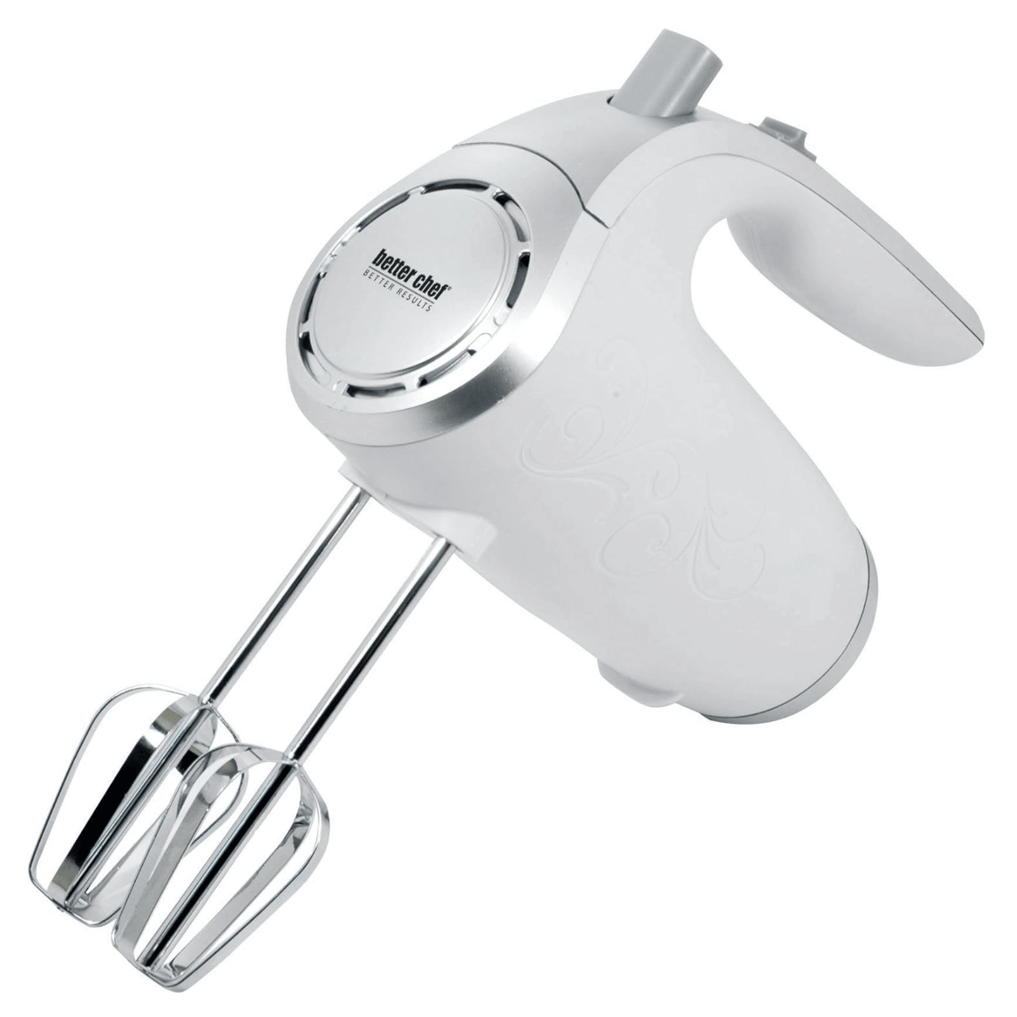 The Better Chef 150-watt hand mixer with stylish silver accents offers versatility with its 5-speed settings, allowing you to mix, blend, whip, and more with ease. Its powerful 150W motor is capable of handling most mixing tasks efficiently. Cleanup is simplified thanks to the stainless steel beaters and dough hooks, which are easy to clean. Additionally, the mixer is designed for convenience, featuring an ergonomic handle and thumb-switch speed controls that enable one-handed operation, enhancing usability in the kitchen.
